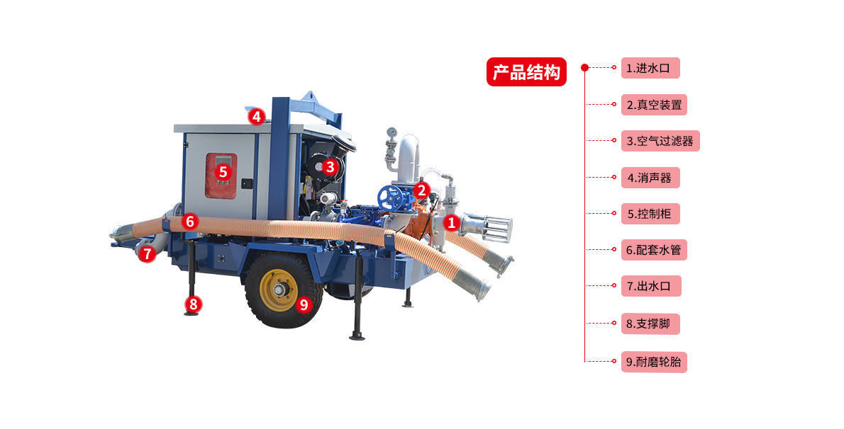 6)該泵還可以與移動(dòng)搶險(xiǎn)車進(jìn)行配套,以達(dá)到臨時(shí)排澇抗旱搶險(xiǎn)的目的。